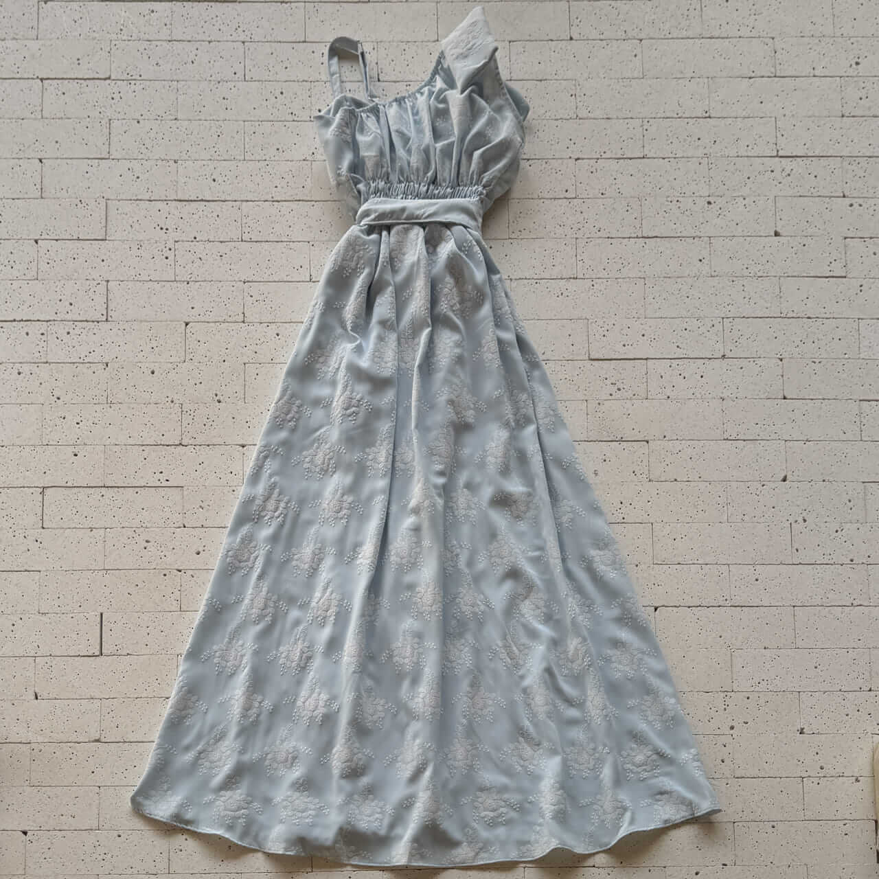 VESTIDO LONGO BORDADO LAÇO NO OMBRO E AMARRAÇÃO FIXA AZUL CLARO