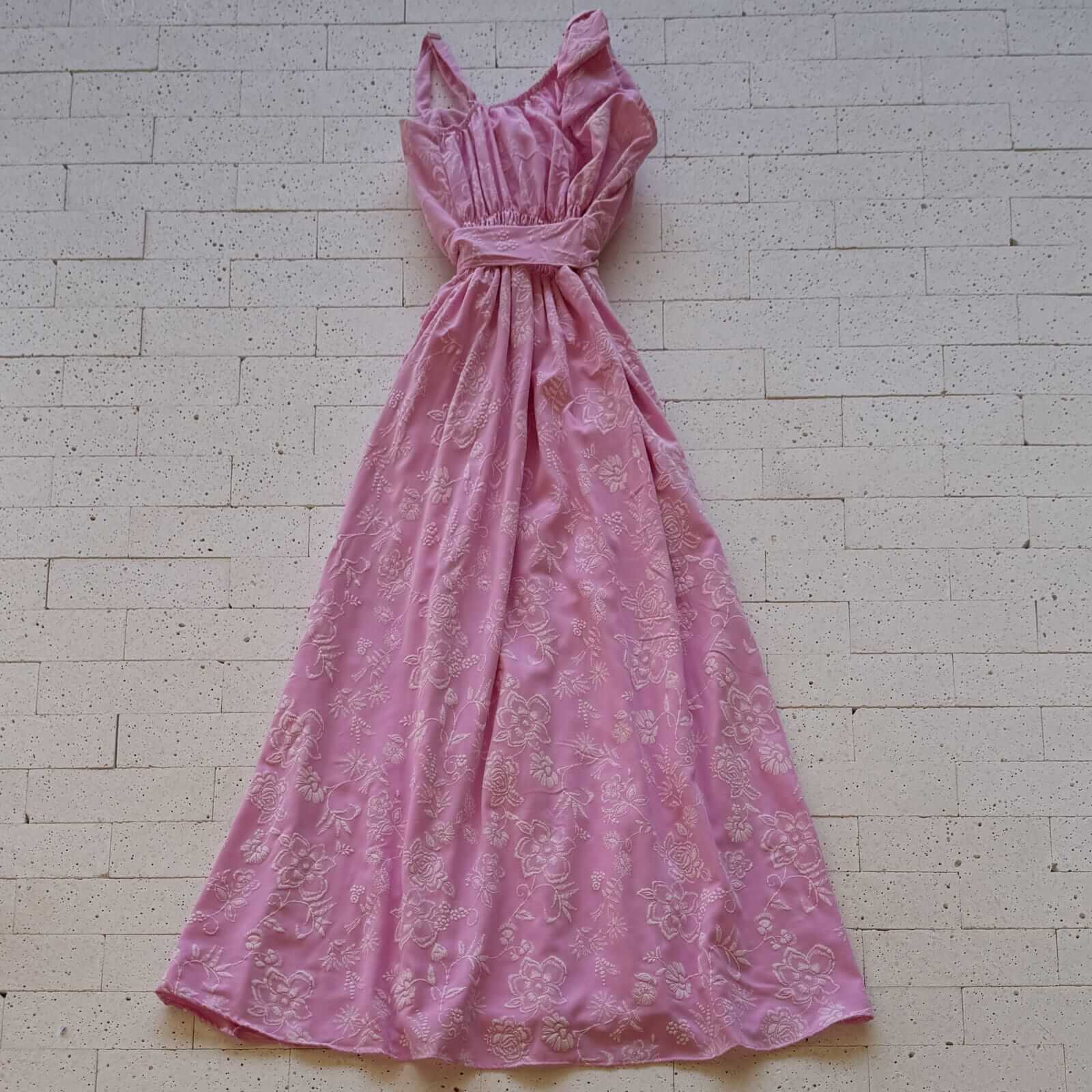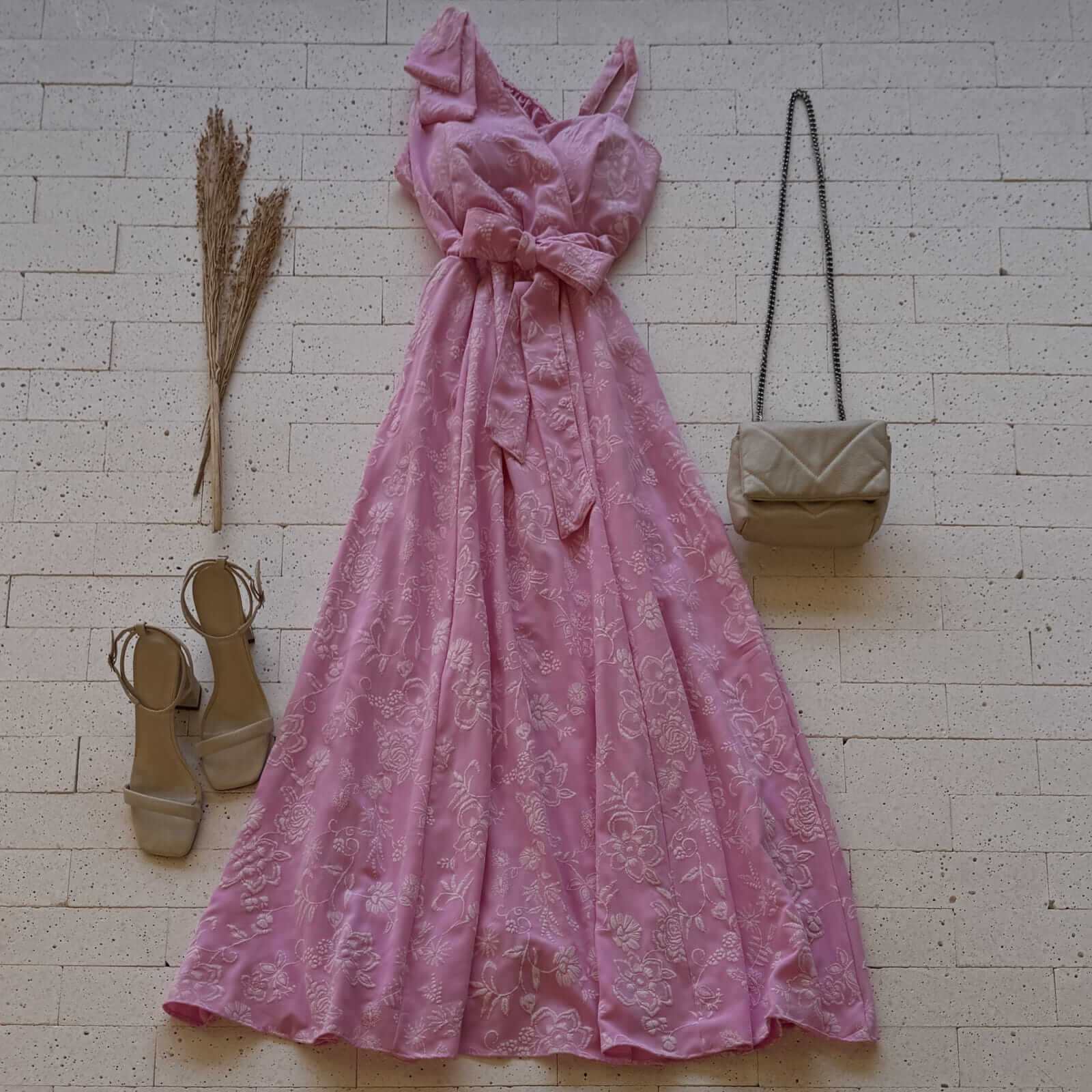 VESTIDO LONGO BORDADO LAÇO NO OMBRO E AMARRAÇÃO FIXA ROSA – Elegância e Delicadeza