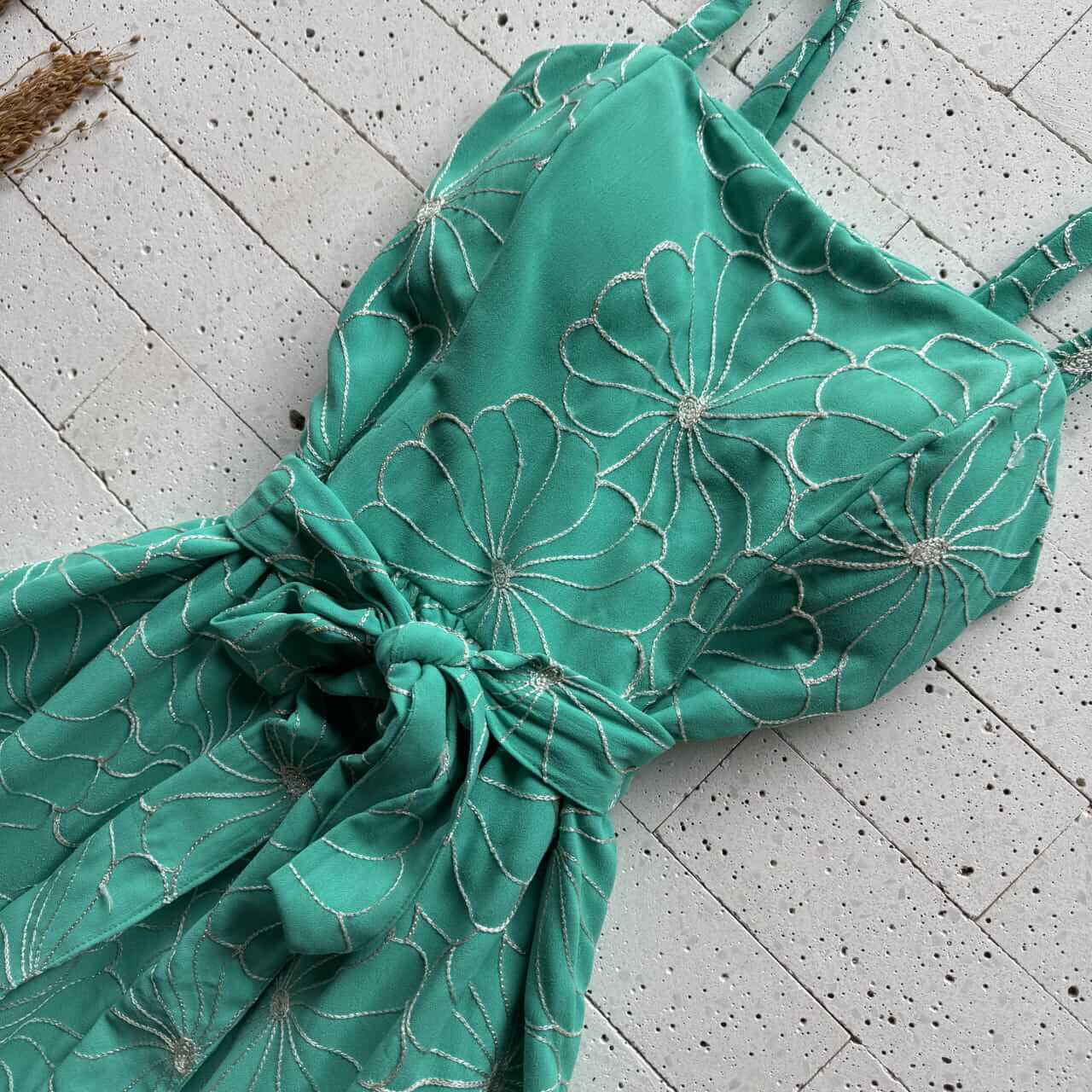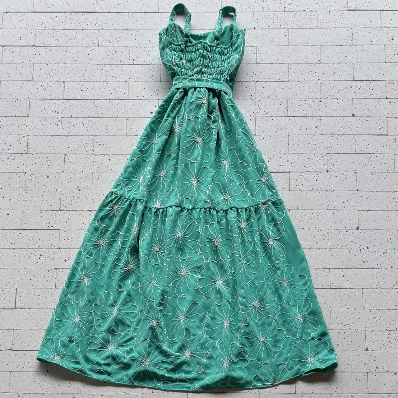 VESTIDO LONGO BORDADO LUREX CAMADAS E CINTO FAIXA MENTA