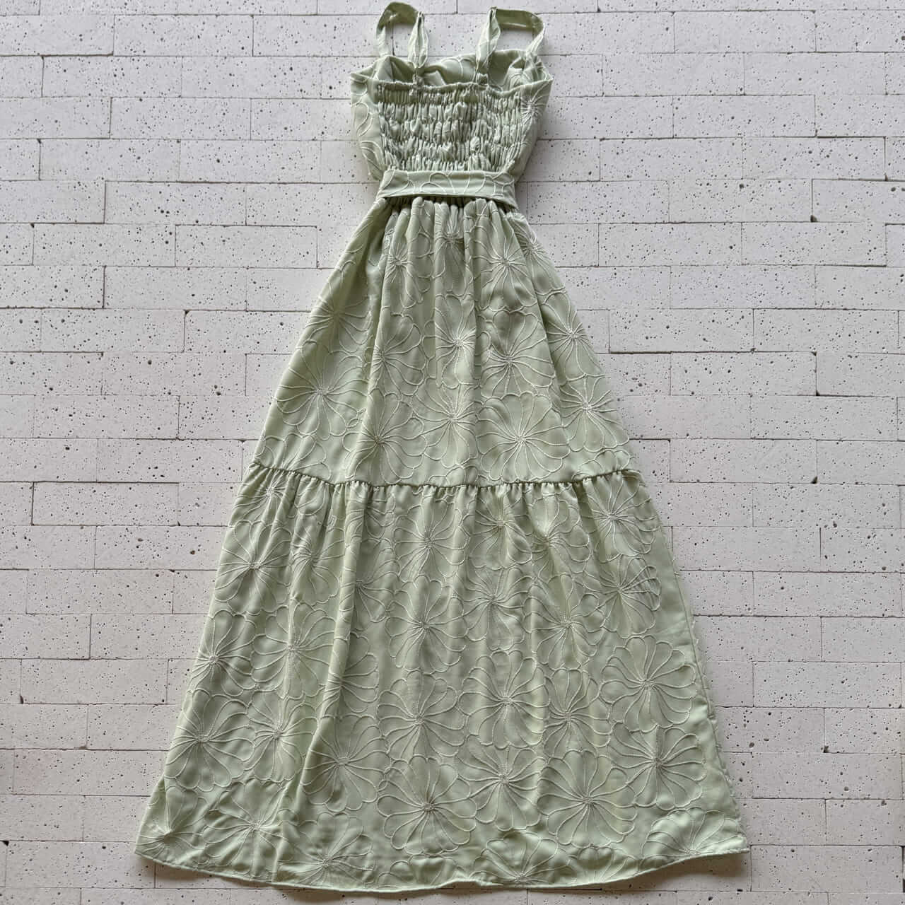 VESTIDO LONGO BORDADO LUREX CAMADAS E CINTO FAIXA VERDE CLARO