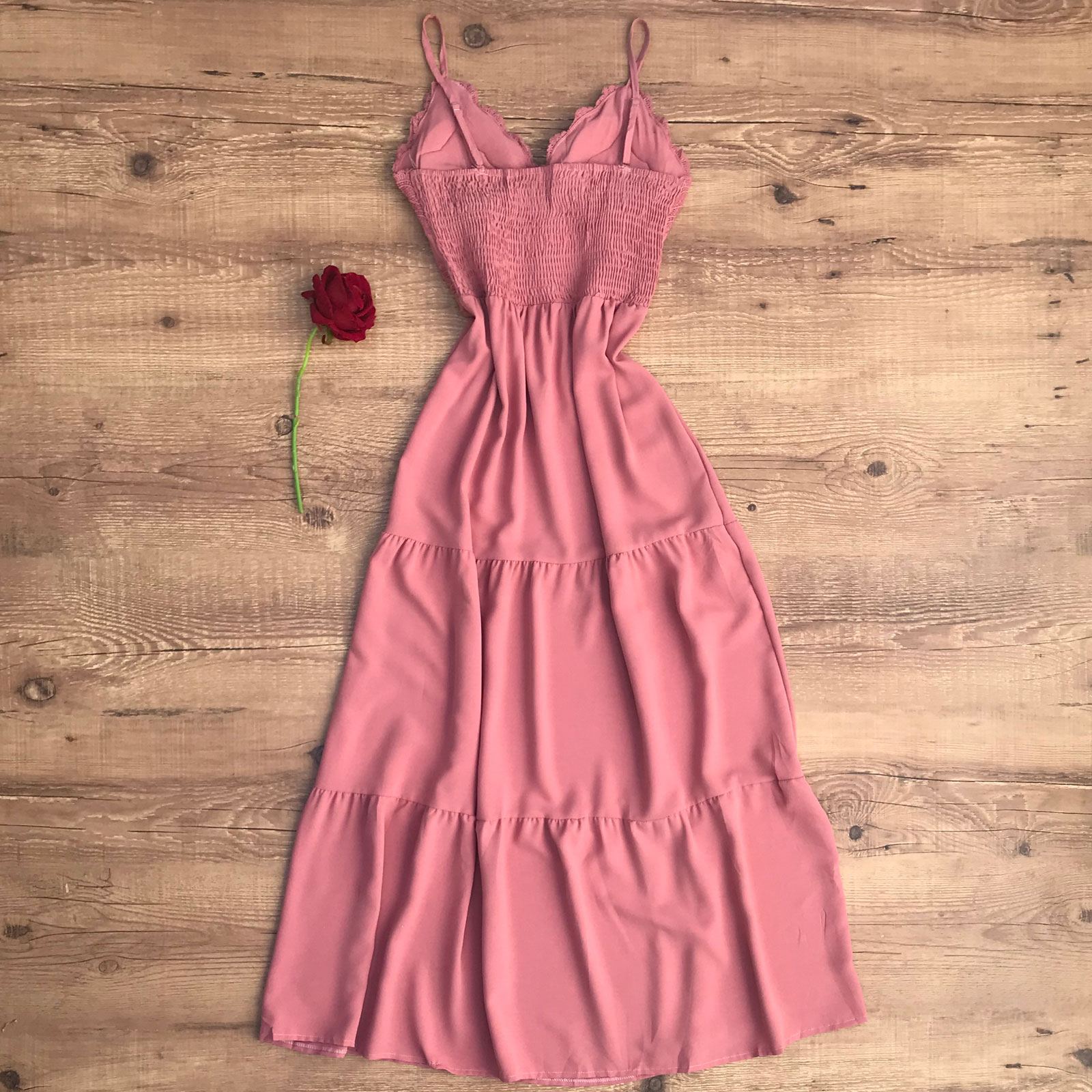 O Vestido Longo Decote em Gripier Rosa Queimado é uma aposta certeira e confortável para usar no verão. Traz um ar de elegância e feminilidade e pode ser usado de várias formas. Nossa peça é fabricada em tecido crepe e possui alças ajustáveis, bem como uma faixa de lastex nas costas. Desta forma, tem caimento perfeito e se adapta muito bem ao corpo. Este modelo apresenta o decote todo trabalhado em gripier e com botões fake. Isso o torna delicado, em junção com as pregas presentes no comprimentos e os vincos no busto. Possui bojo para proporcionar maior conforto.