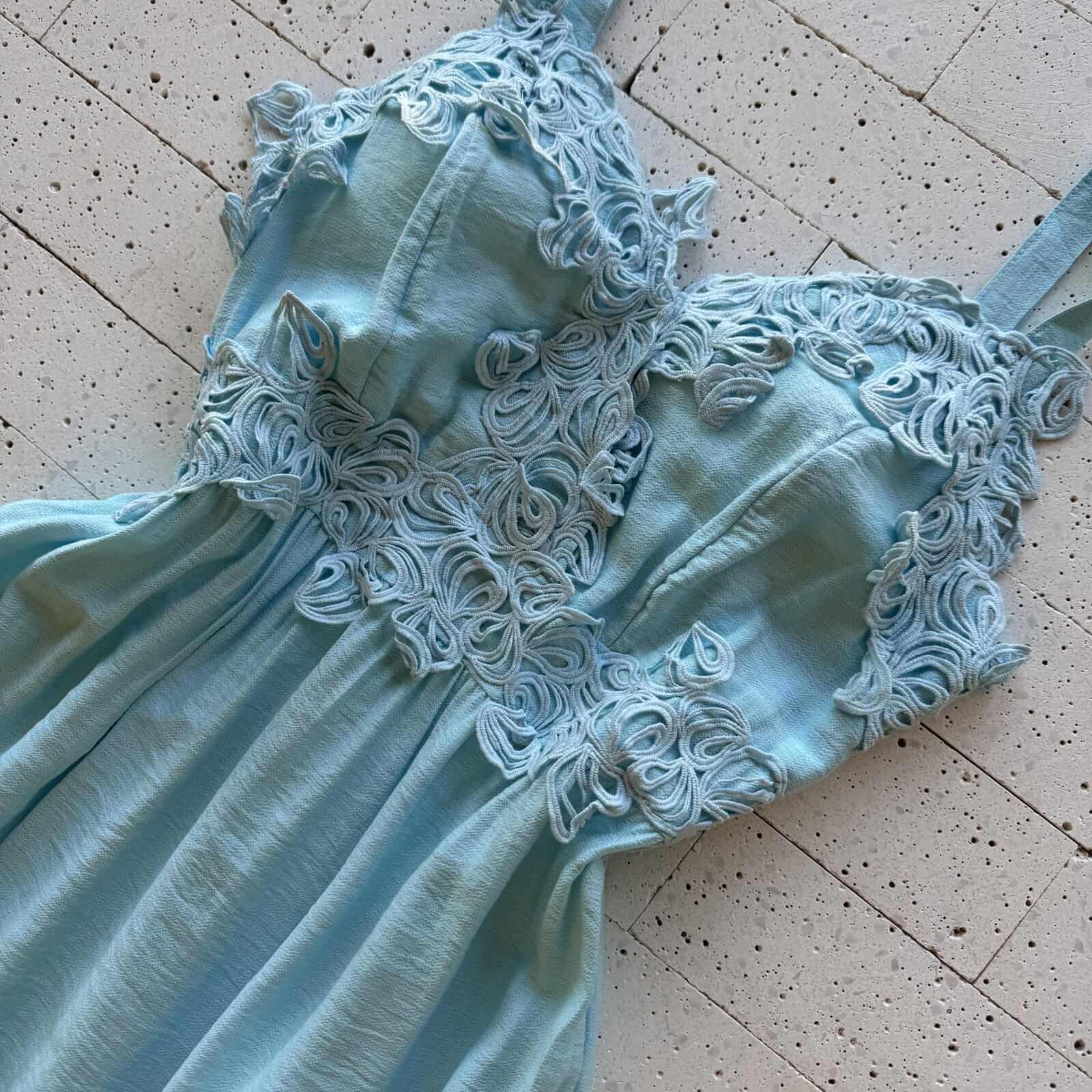 Vestido Longo Gola V Camadas e Gripier Detalhado Azul – Sofisticação com leveza para os dias mais especiais