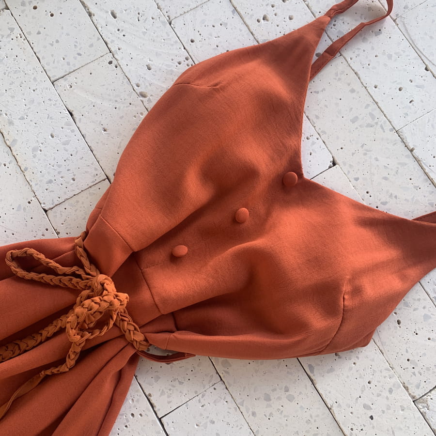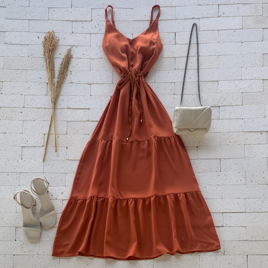 VESTIDO LONGUETE ALCINHA COM BOTÕES E AMARRAÇÃO TELHA