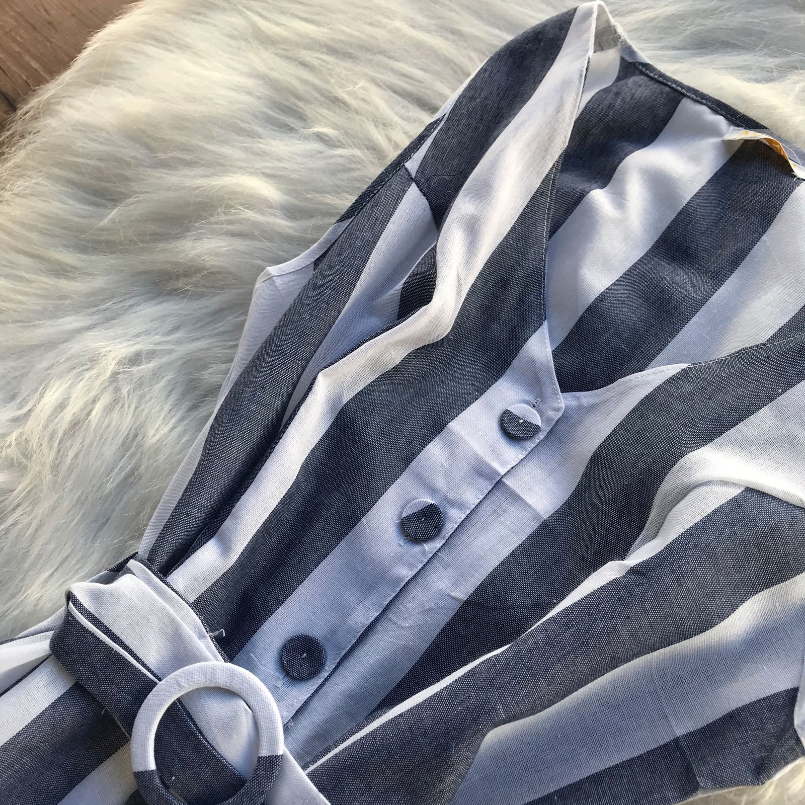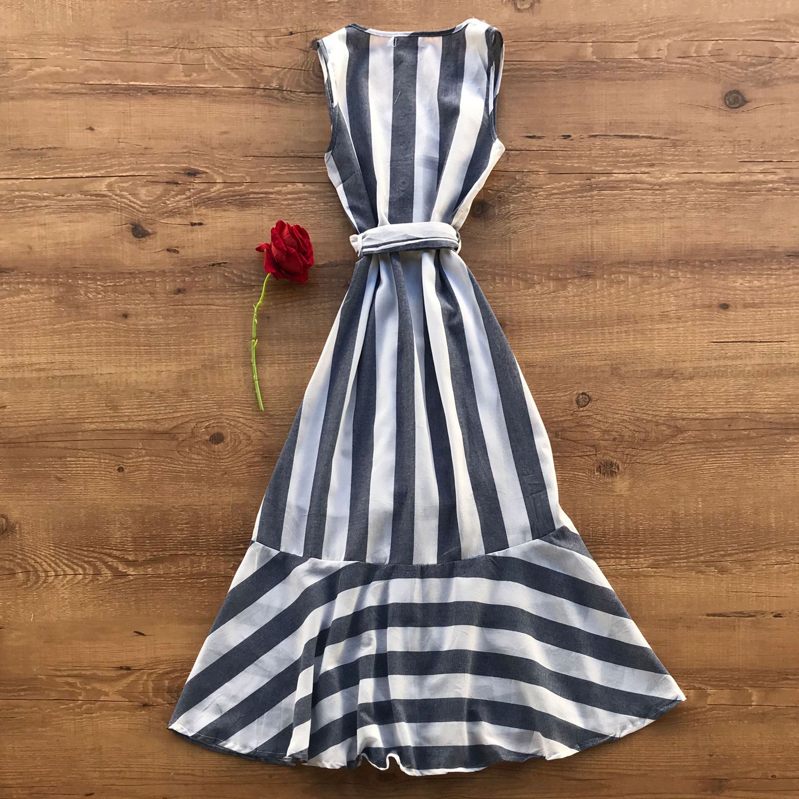 Como usar seu Vestido Longuete Listrado Com Cinto Azul Marinho