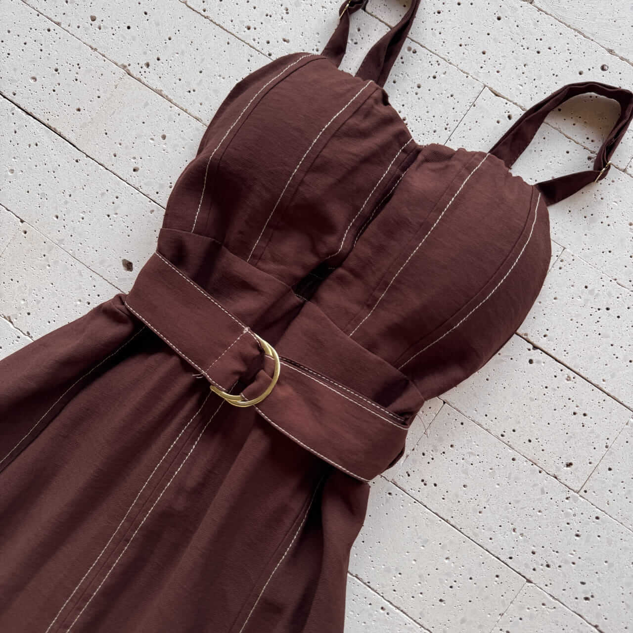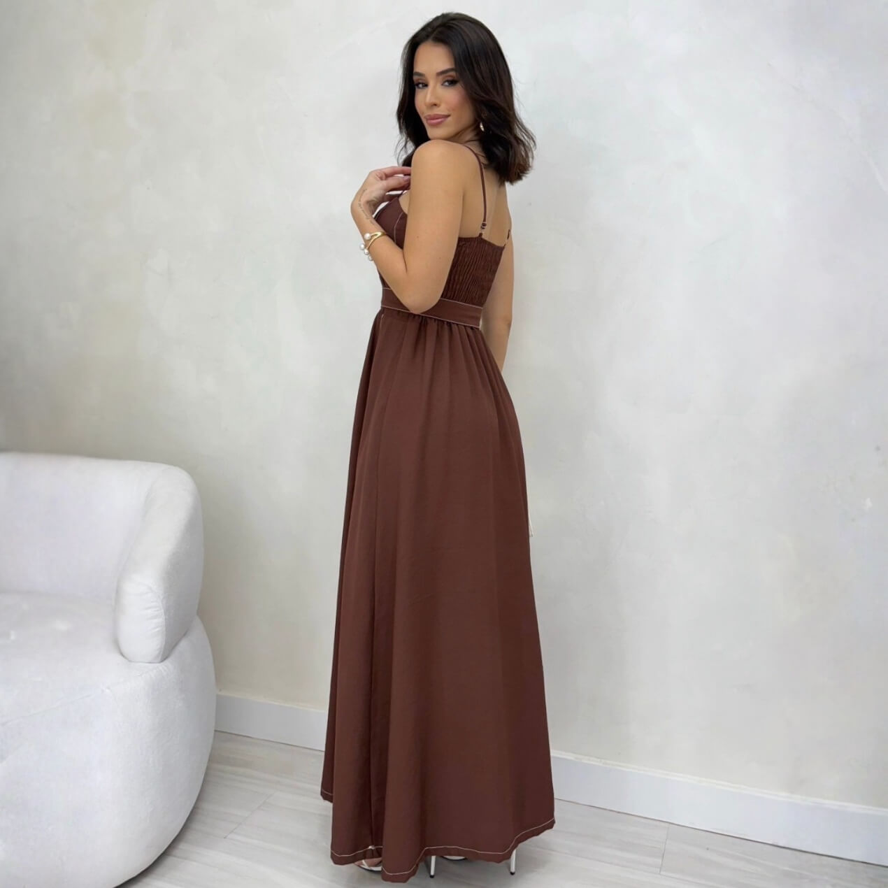 VESTIDO LONGUETE MARRANT DETALHE ABERTURA E CINTO CAFÉ