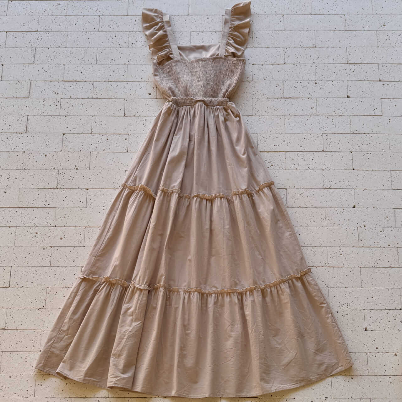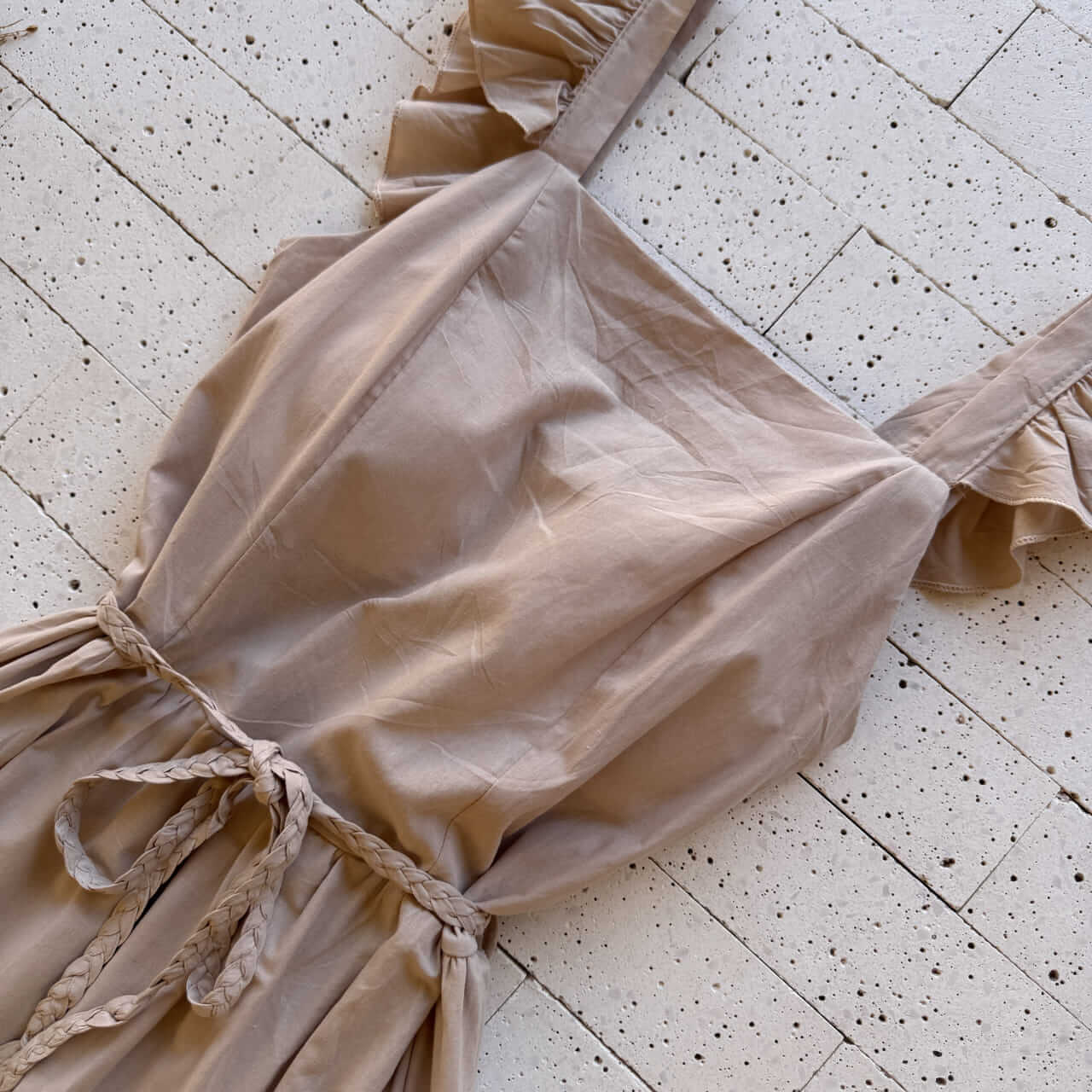 VESTIDO MIDI ALÇA BABADOS E CINTO TRANÇADO BEGE