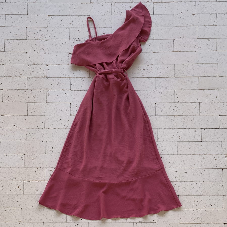 VESTIDO MIDI BABADOS E AMARRAÇÃO GOIABA
