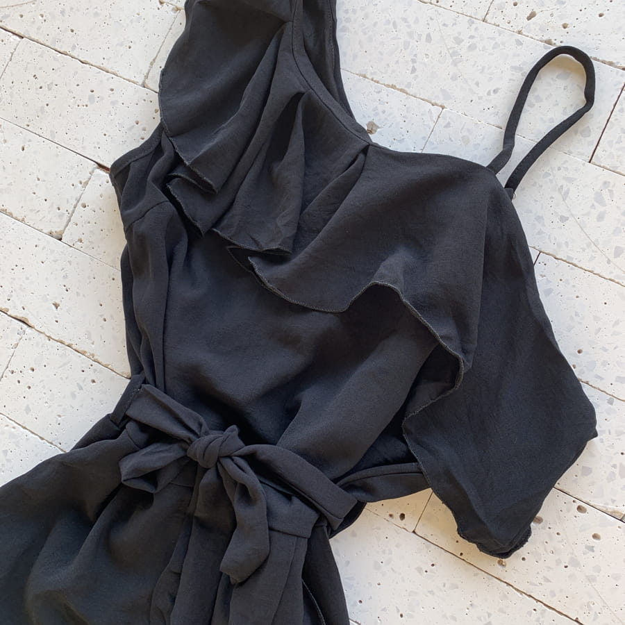 VESTIDO MIDI BABADOS E AMARRAÇÃO PRETO