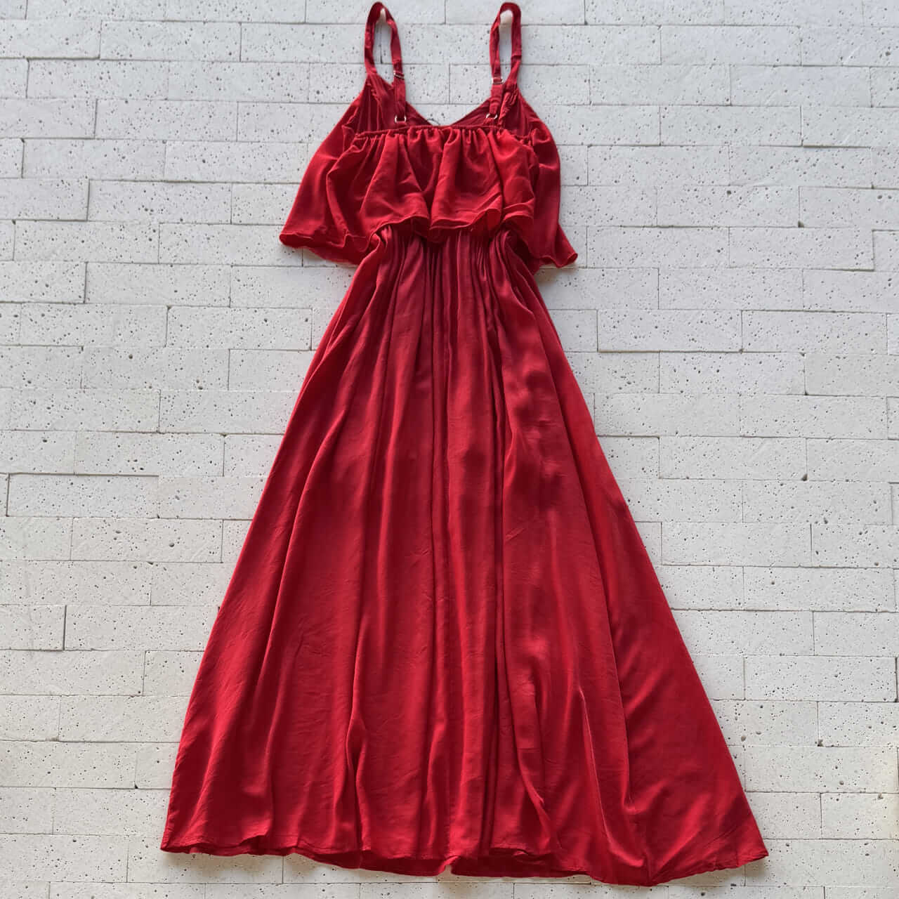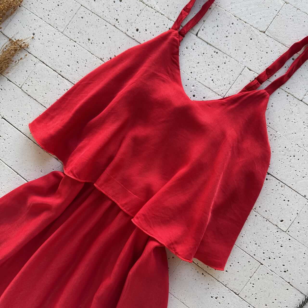 VESTIDO MIDI COM BABADO NO BUSTO VERMELHO – Movimento, Leveza e Elegância em Cada Detalhe