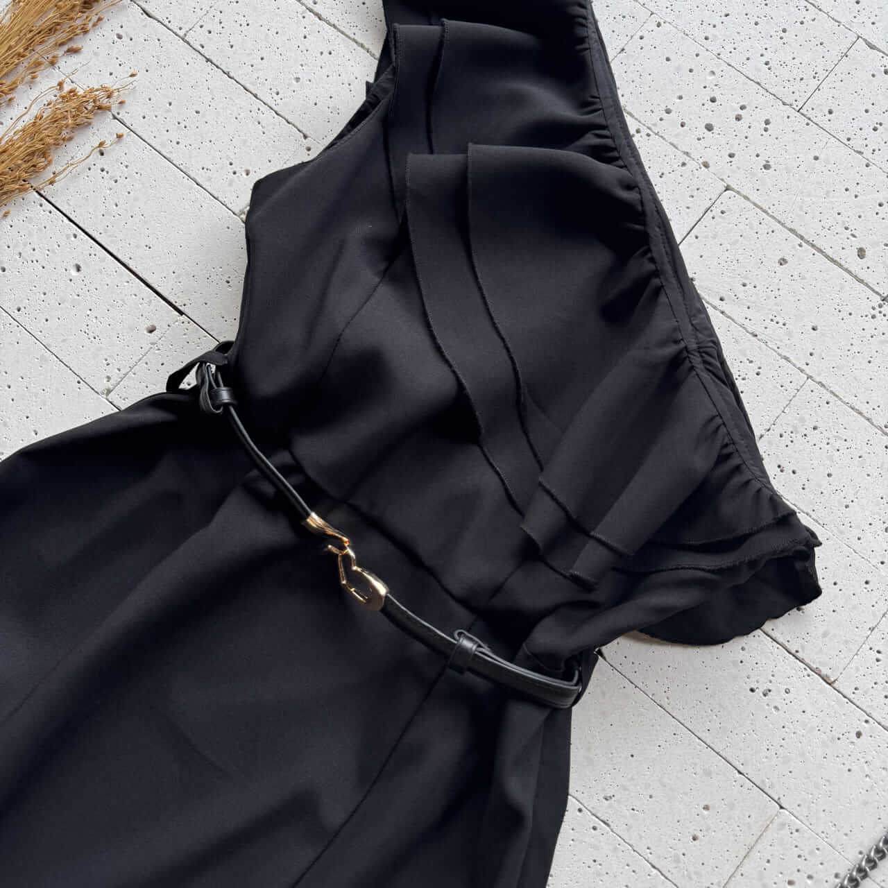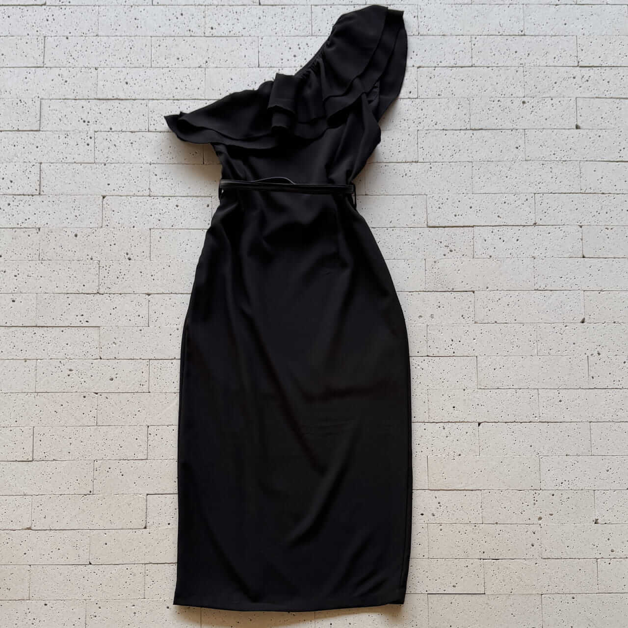 VESTIDO MIDI FORRADO UM OMBRO SÓ BABADOS E FENDA PRETO – Clássico, Elegante e Atemporal