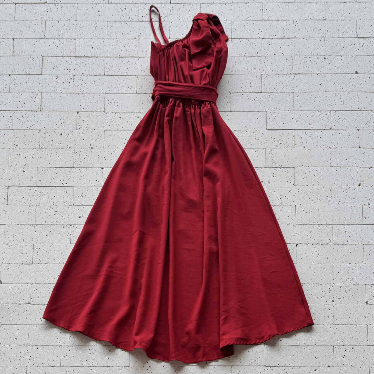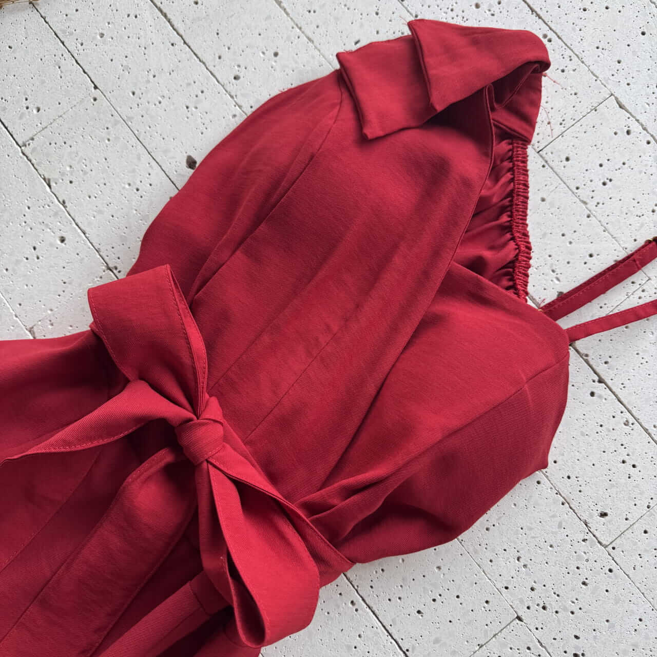 VESTIDO MIDI MARRANT COM LAÇO NO OMBRO E CINTO FAIXA VERMELHO