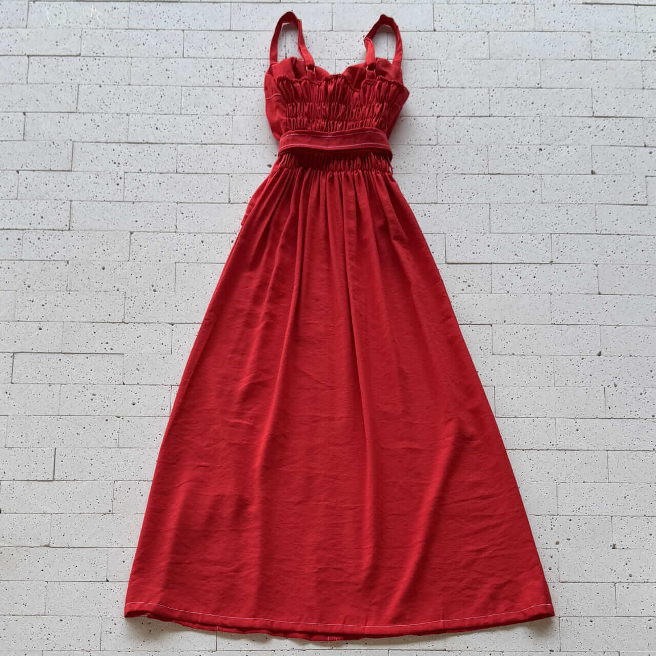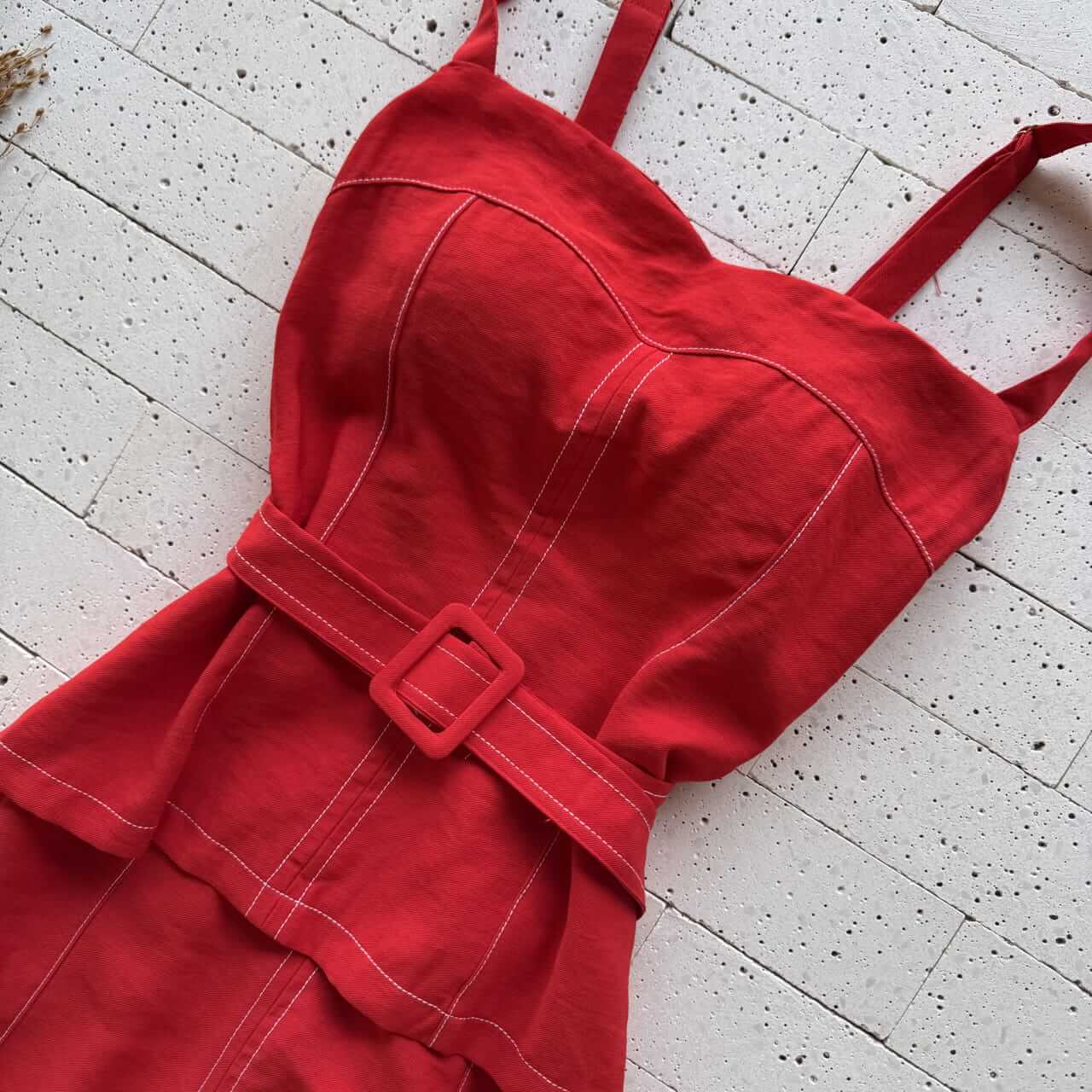 VESTIDO MIDI MARRANT DETALHE SOBREPOSTO E CINTO FAIXA VERMELHO