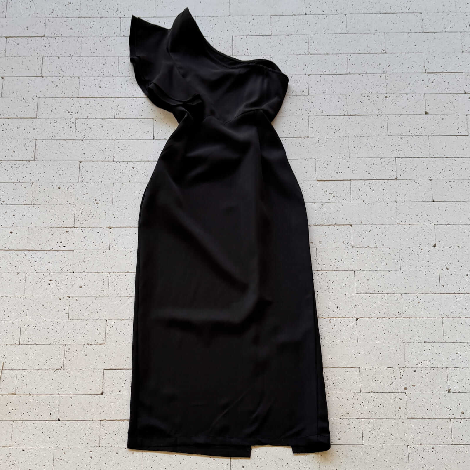 VESTIDO MIDI UM OMBRO SÓ BABADOS E FENDA PRETO – Elegância Assimétrica com Toque de Sofisticação