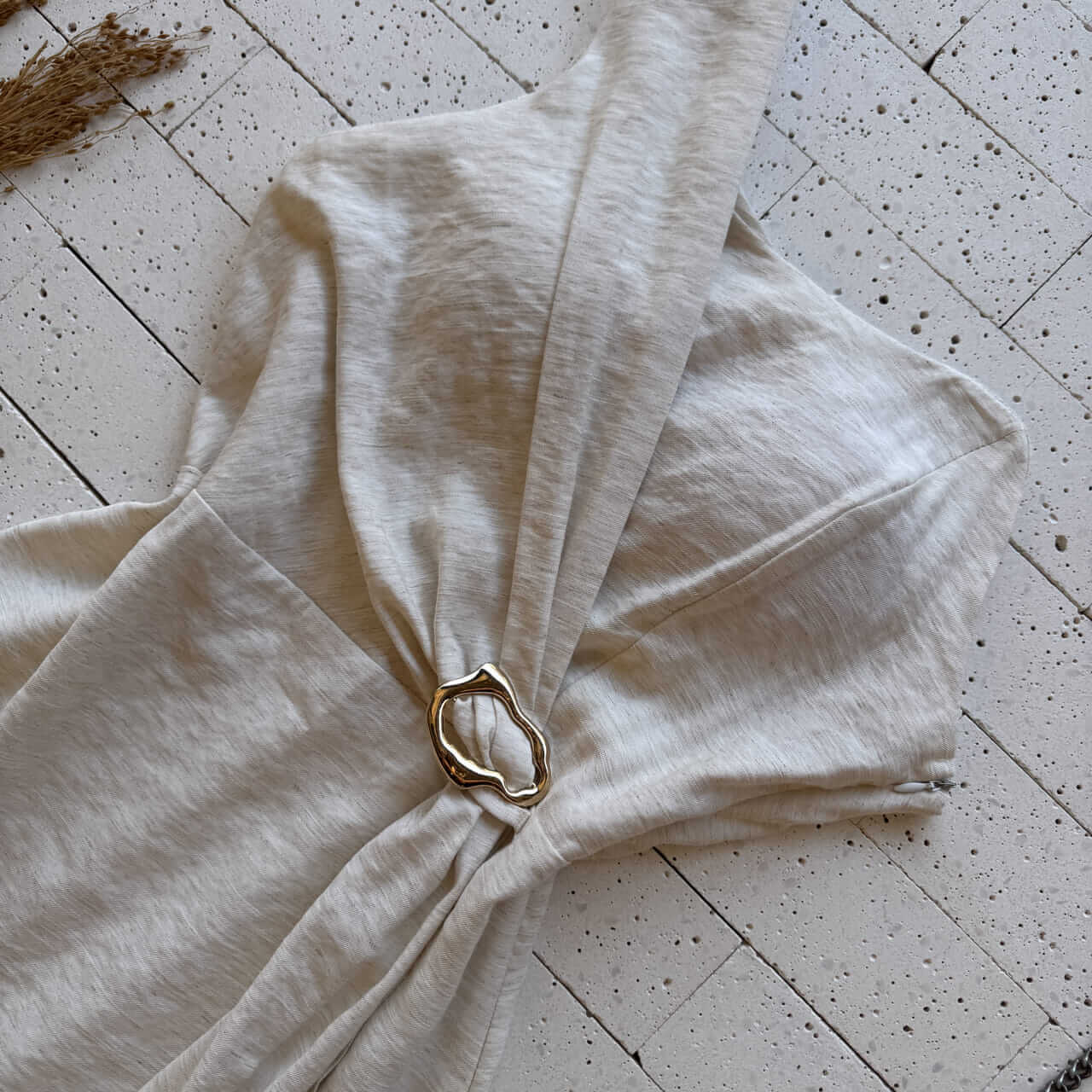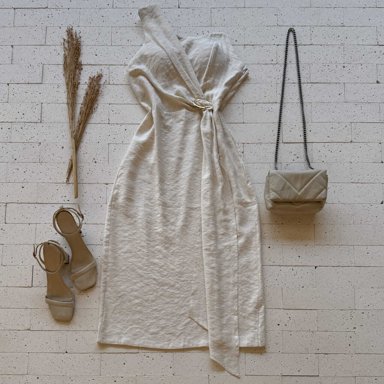 VESTIDO MIDI UM OMBRO SÓ DETALHE FIVELA CRU – Minimalismo Chic para Todas as Ocasiões