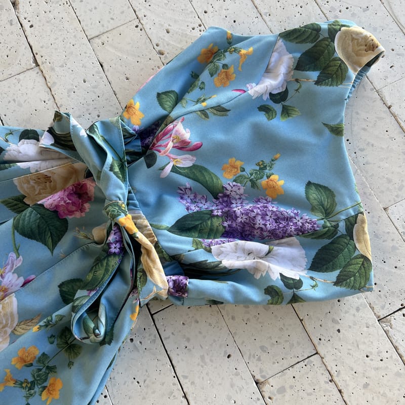 VESTIDO MIDI UM OMBRO SÓ FLORAL COM AMARRAÇÃO AZUL
