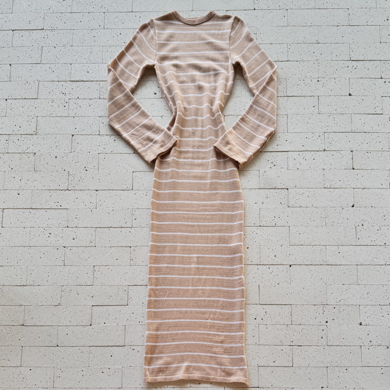 VESTIDO MODAL LISTRADO LONGUETE COM FENDA BEGE