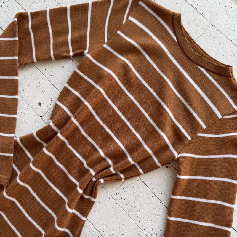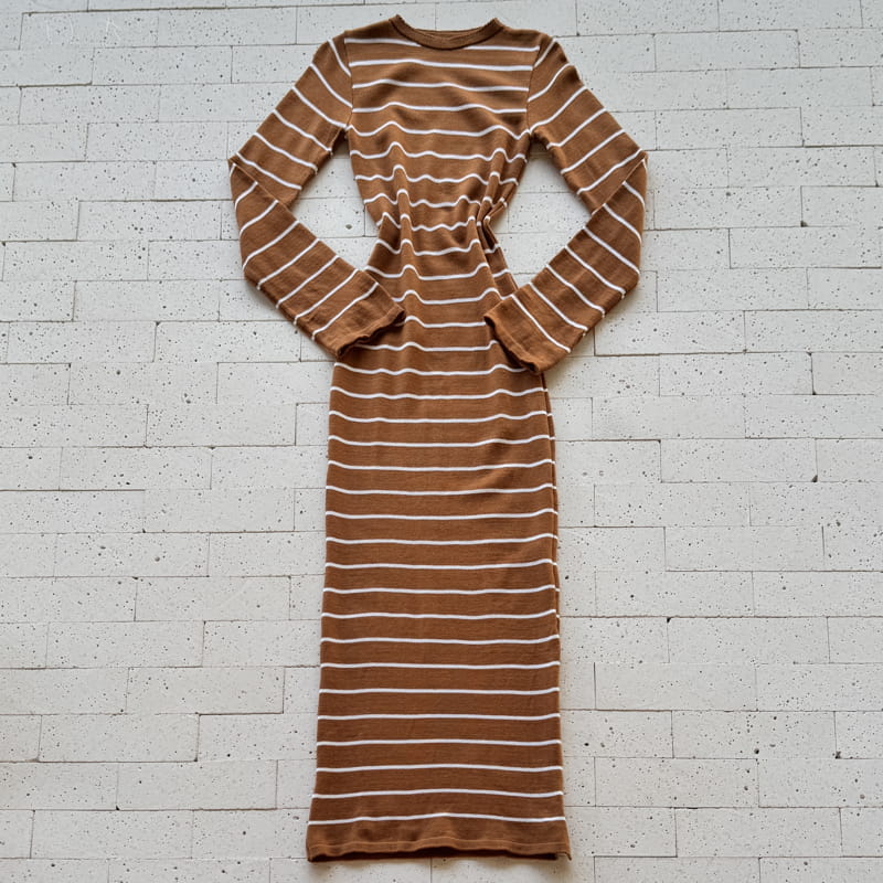 VESTIDO MODAL LISTRADO LONGUETE COM FENDA CARAMELO – Tricot Moderno com Listras Elegantes