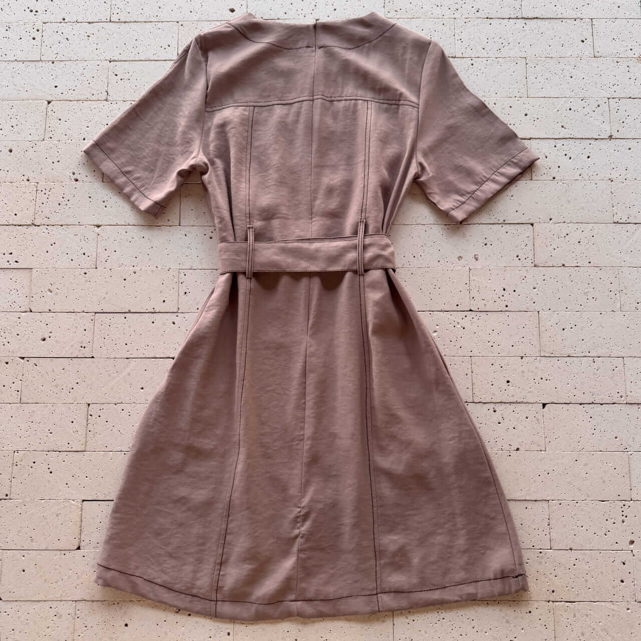 VESTIDO PESPONTADO COM CINTO NUDE – Elegância Minimalista e Caimento Impecável