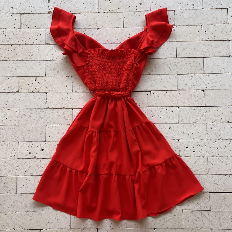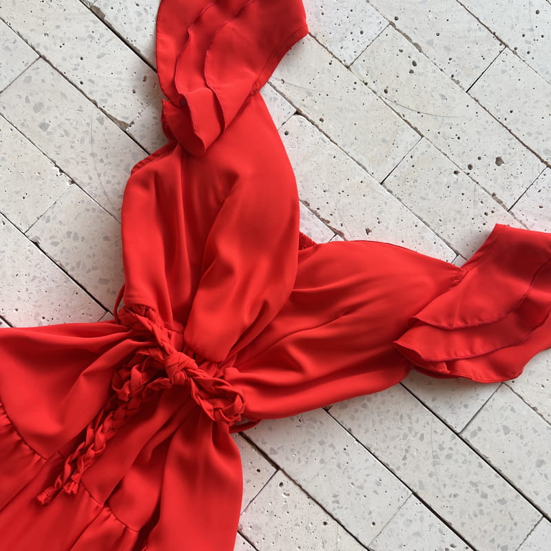 VESTIDO TRÊS MARIAS ALÇA BABADOS E AMARRAÇÃO TRANÇADA VERMELHO