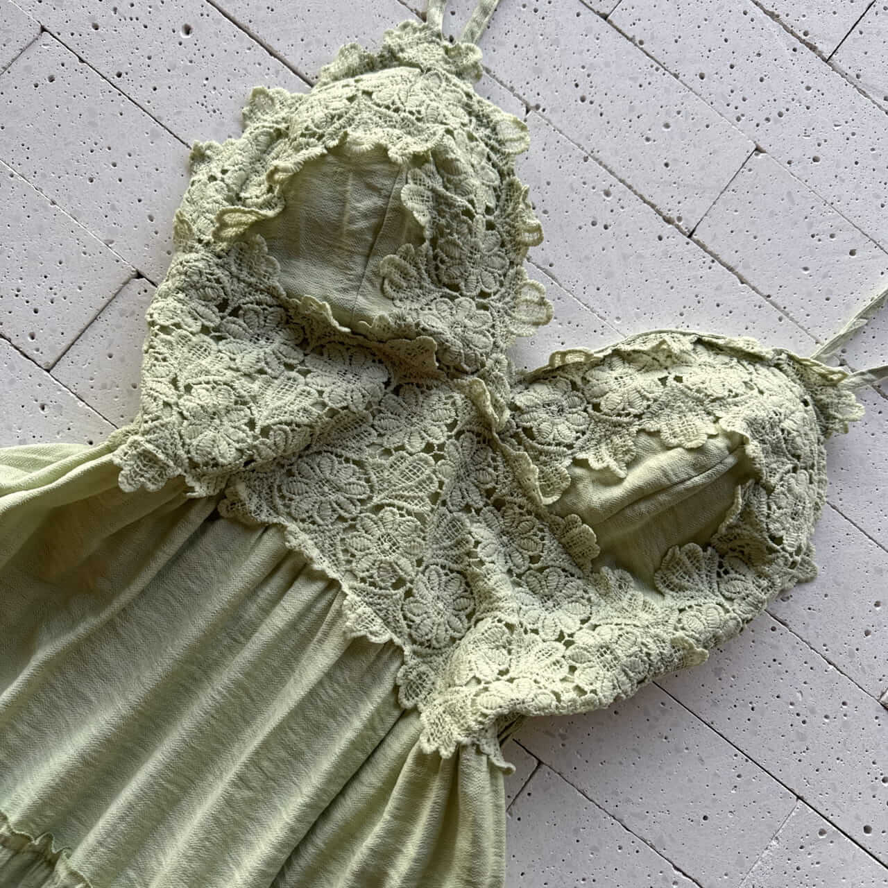 Este vestido três marias na cor verde é a definição de charme com toque artesanal. O busto com bojo estruturado e aplicação de renda gripier floral proporciona um visual delicado e feminino. As alças finas ajustáveis garantem conforto e sustentação ideal, enquanto o elástico nas costas oferece flexibilidade e excelente caimento. A saia com recortes em camadas traz movimento leve e fluido, perfeito para dias ensolarados e ocasiões especiais. Um vestido que une leveza, estilo e um toque artesanal irresistível.