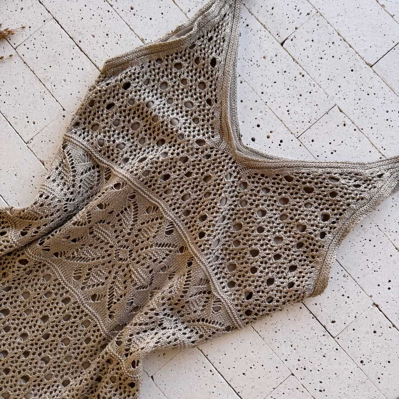 • Tecido em tricô trabalhado com padronagens vazadas e florais