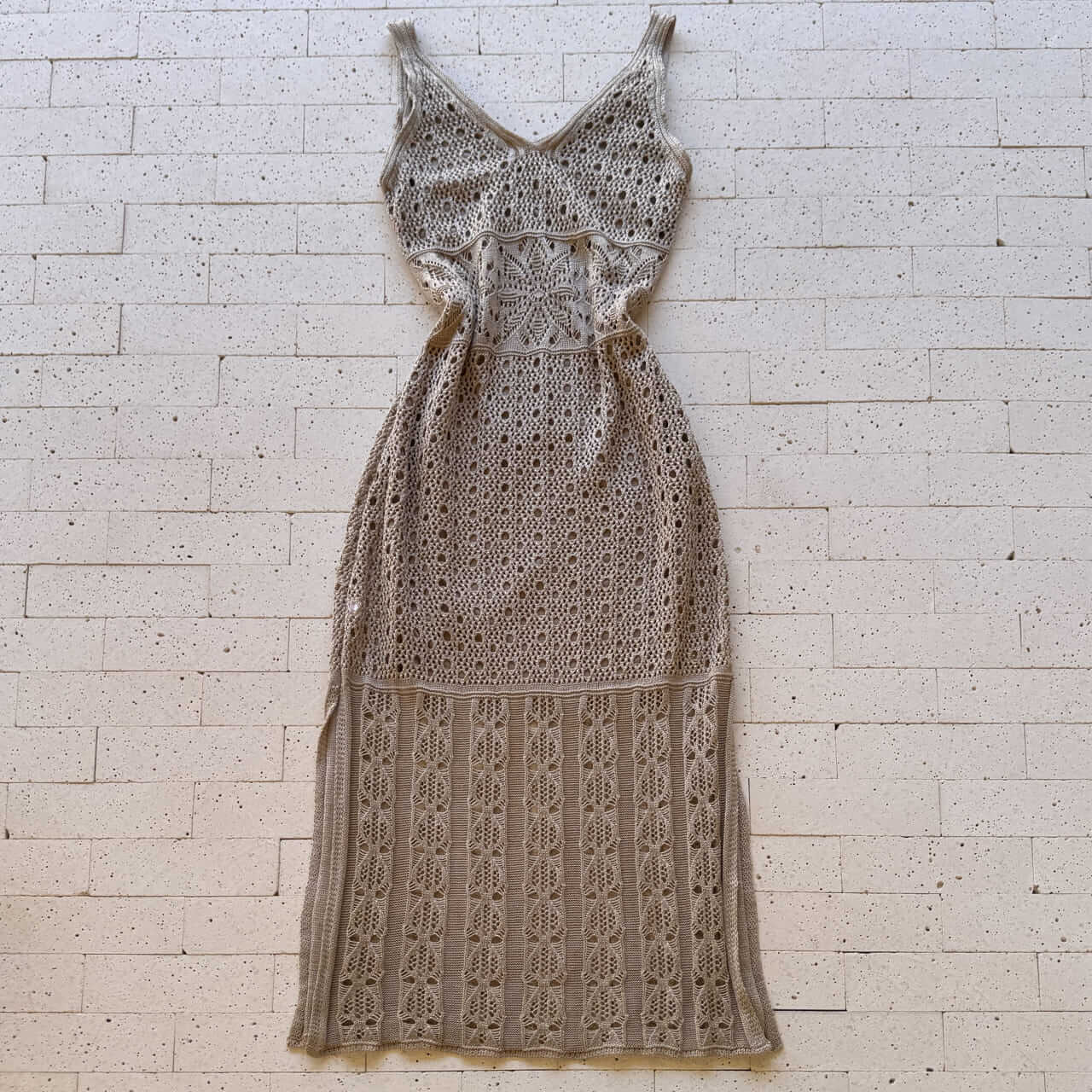 VESTIDO TRICÔ MIDI DETALHE LUREX COM FENDA BEGE – Elegância Artesanal e Toque Sofisticado
