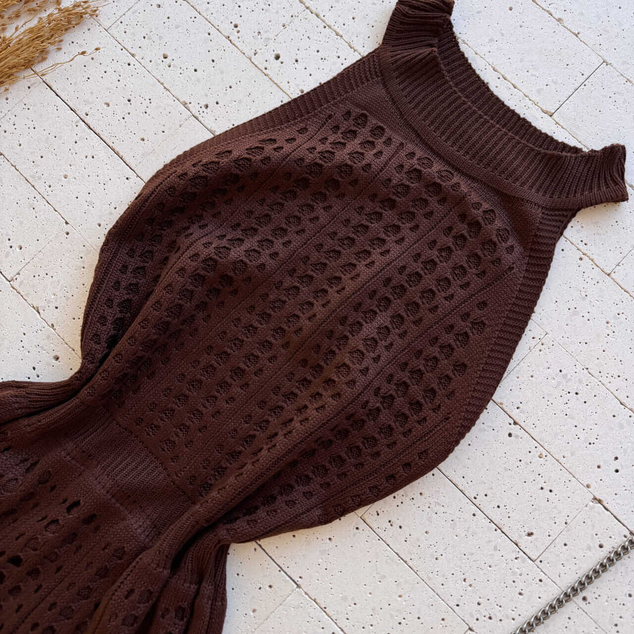 O tom café cria composições sofisticadas com acessórios dourados, sandálias neutras e bolsas estruturadas. Para eventos noturnos, combine com maquiagem iluminada e acessórios metálicos para destacar a intensidade da cor e a textura do tricô.