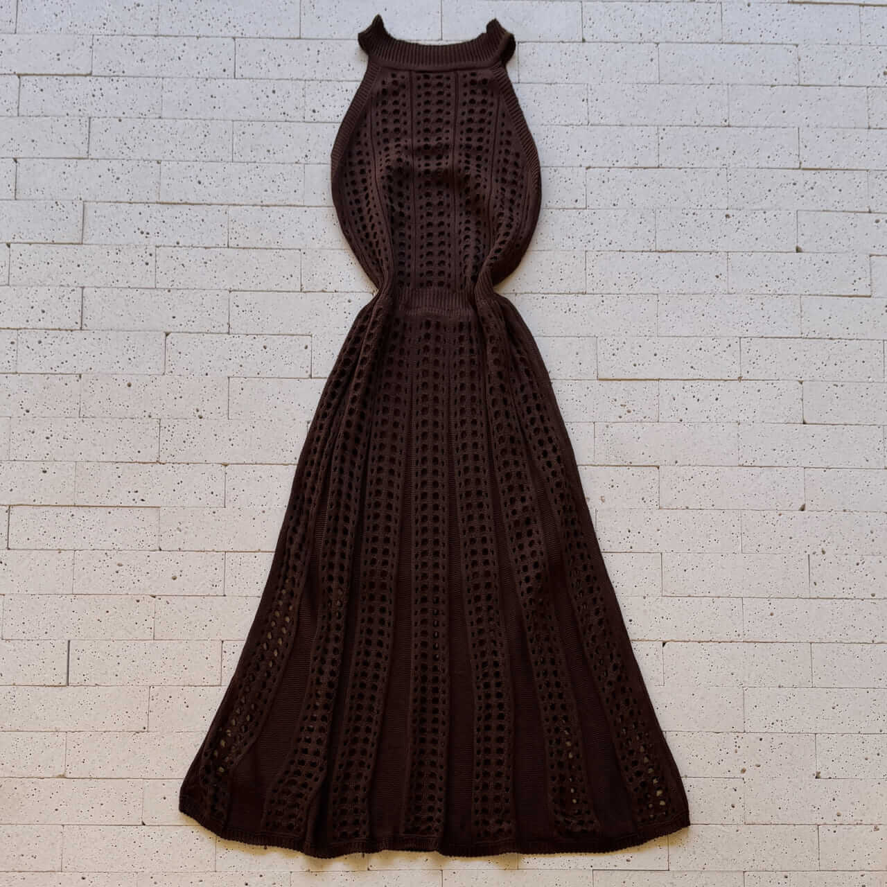 No tom café, este vestido entrega um visual sofisticado e moderno, destacando com ainda mais profundidade o trabalho do tricô em ponto vazado. A modelagem com foco nos ombros, cria um desenho elegante no tronco, enquanto a cintura ganha uma leve definição natural através da própria trama. O comprimento midi proporciona movimento fluido, e o forro curto garante conforto sem comprometer a beleza da textura vazada.