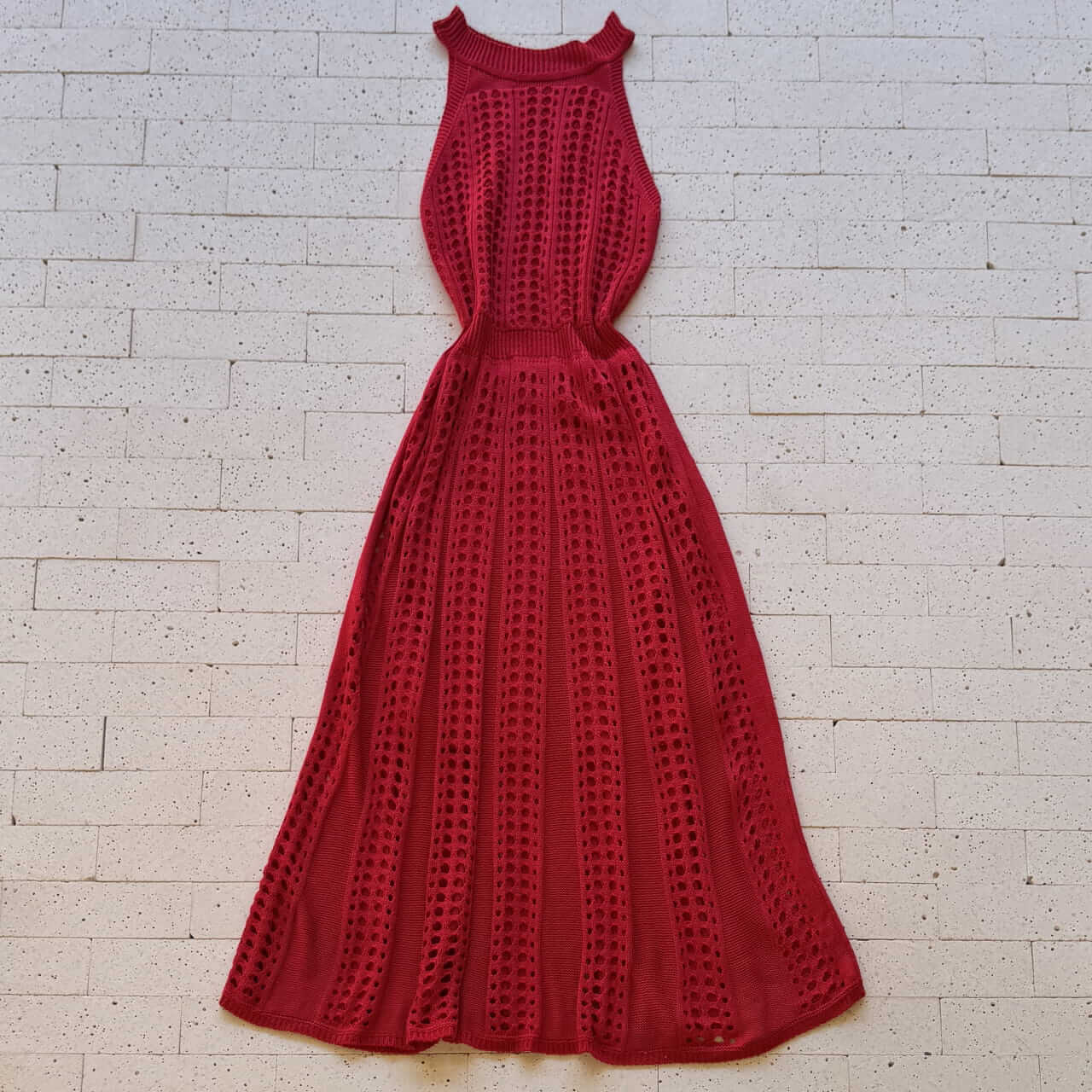 Em um tom vermelho intenso e sofisticado, este vestido destaca ainda mais o trabalho artesanal do tricô em ponto vazado. A modelagem halter sem decote realça os ombros e traz um visual moderno e elegante. O comprimento midi garante movimento fluido, e o forro curto oferece conforto e acabamento impecável sem comprometer o charme da textura vazada.