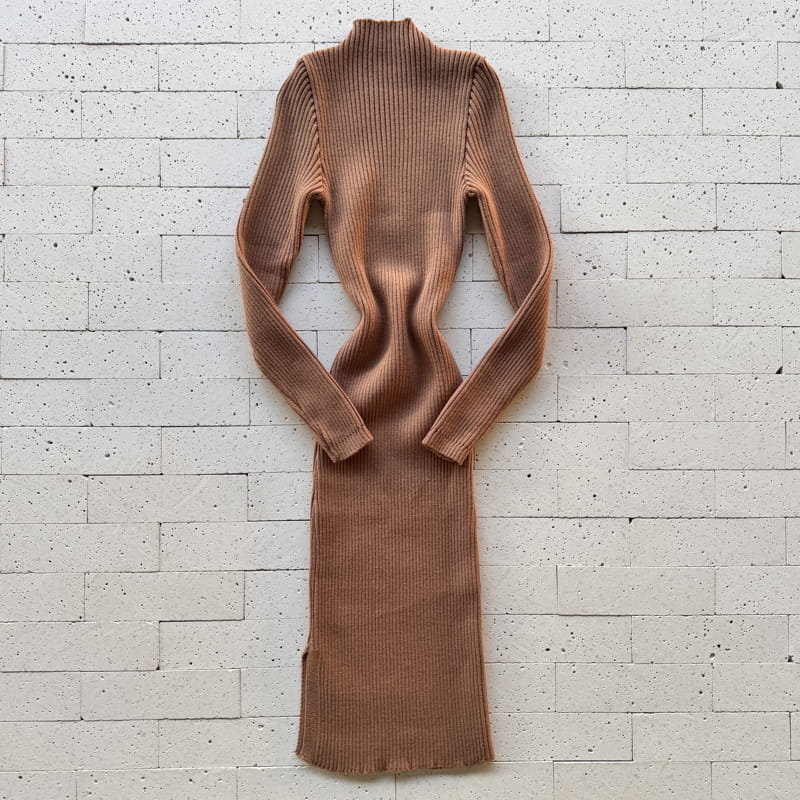 VESTIDO TRICÔ MODAL MIDI CANELADO COM FENDA BEGE – Versatilidade Atemporal