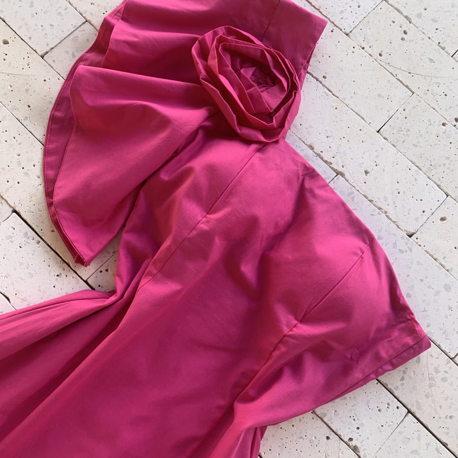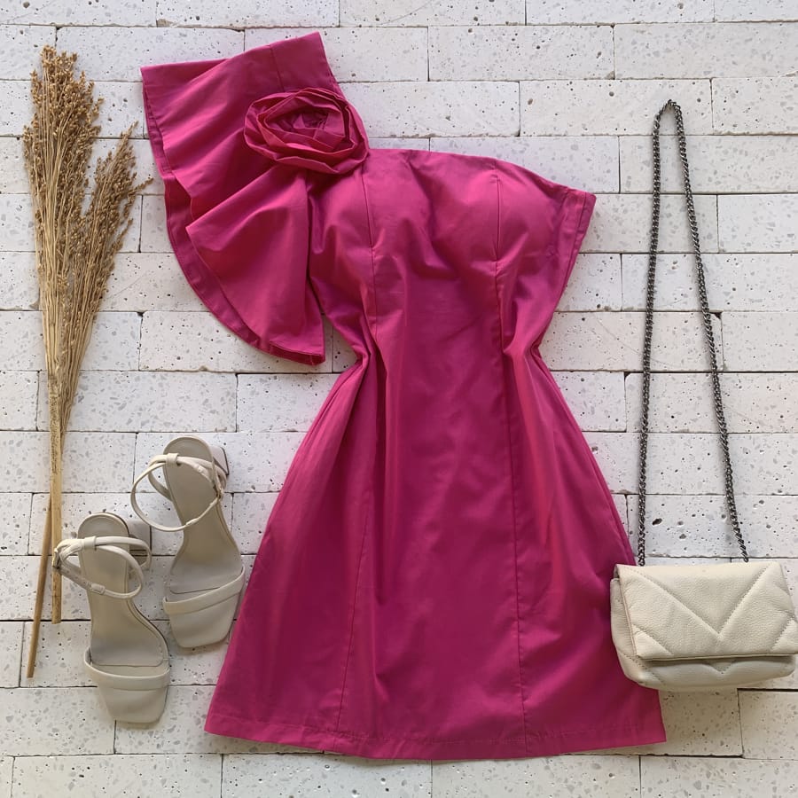 Como usar seu Vestido Tricoline Um Ombro Só Morcego Detalhe Flor Pink