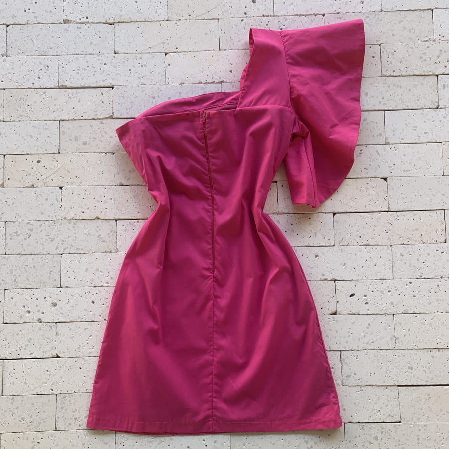 VESTIDO TRICOLINE UM OMBRO SÓ MORCEGO DETALHE FLOR PINK