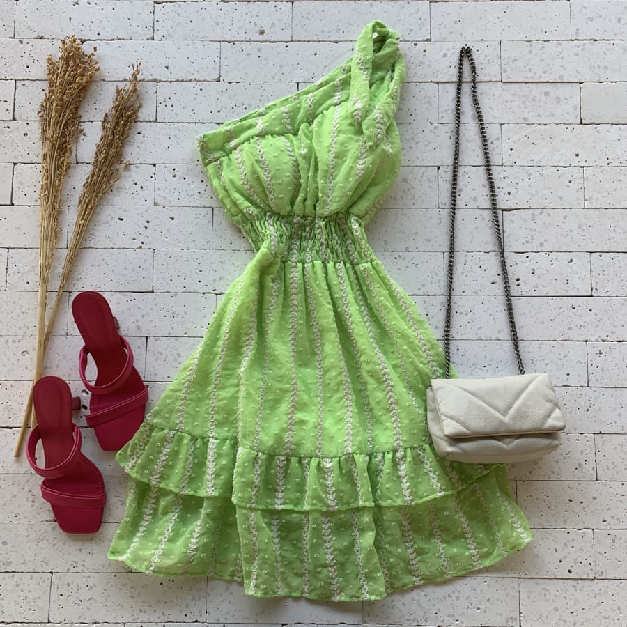 Como usar seu Vestido Um Ombro Só Chiffon Pipoca Detalhado Verde Limão