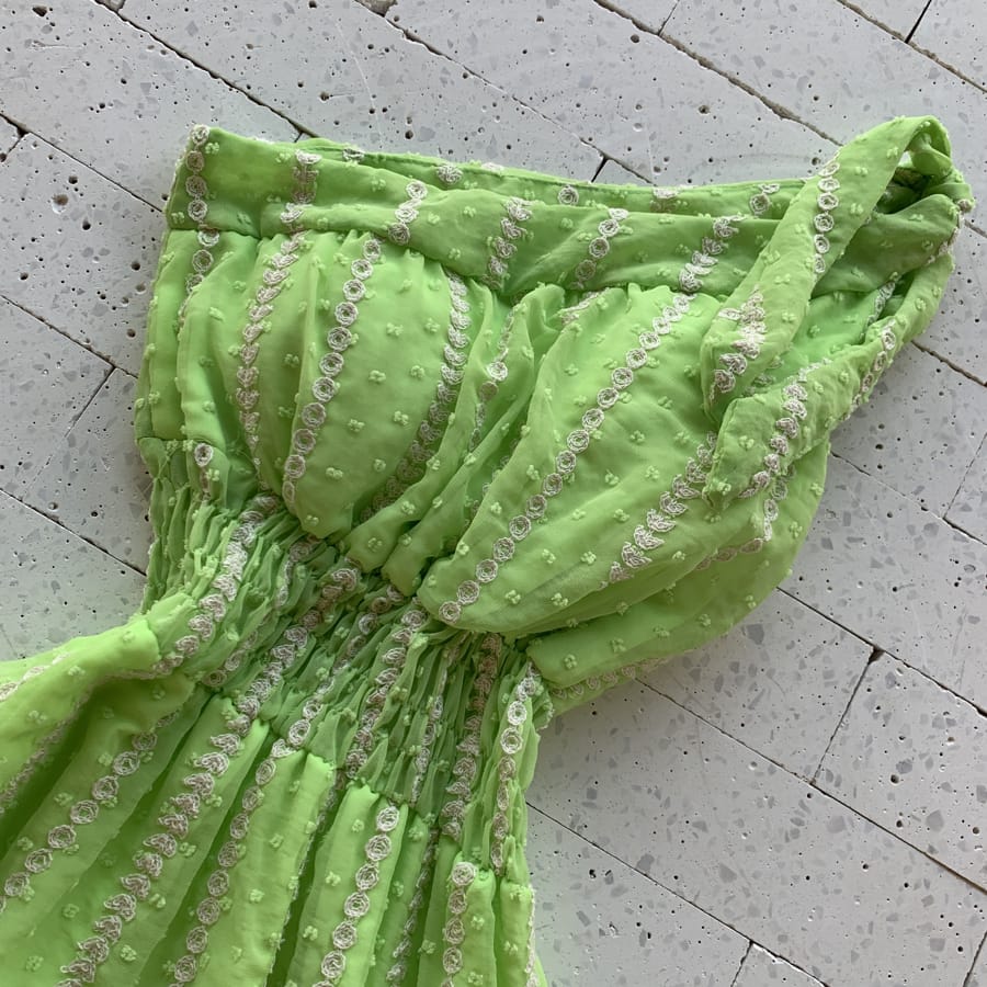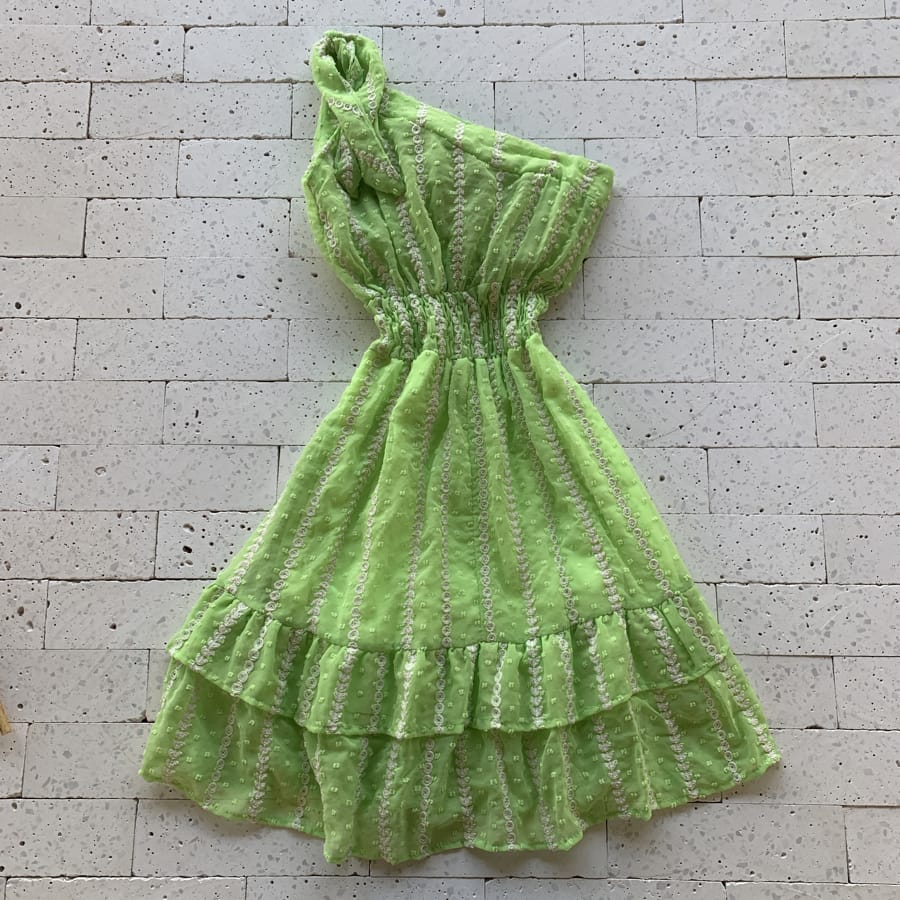 VESTIDO UM OMBRO SÓ CHIFFON PIPOCA DETALHADO VERDE LIMÃO
